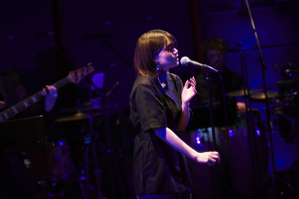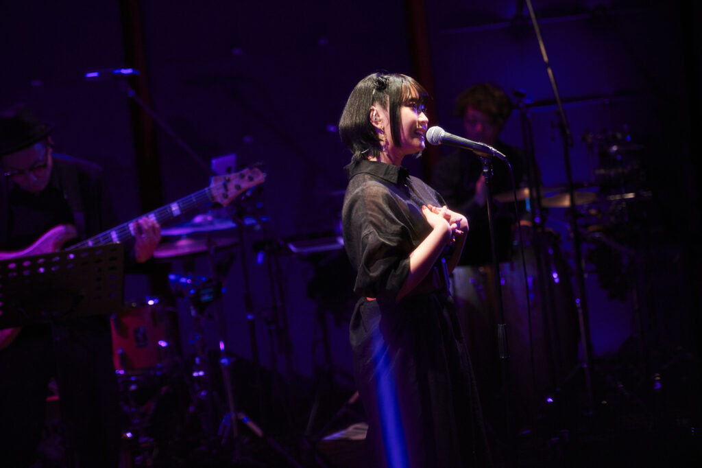 トップバッターを飾ったのはメインキャラクターを演じる二ノ宮さん。先輩声優たちより早く歌うことになり、最近ではトップクラスに緊張していると話していたが、曲が始まると表情は一転。しっとりとしたピアノとドラム、ベースが響くなか、二ノ宮さんの柔らかな歌声が会場に浸透していき、「夢の中へ」という曲名通りのふわりとした優しい空間が生まれていた。