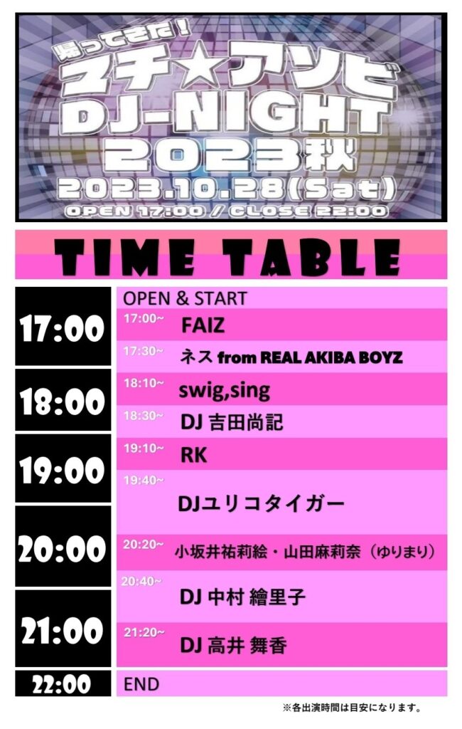 17時からは徳島club GRINDHOUSEにて行われる『帰ってきた!マチ★アソビ DJ-NIGHT 2023秋』にもswing,singが出演いたします!